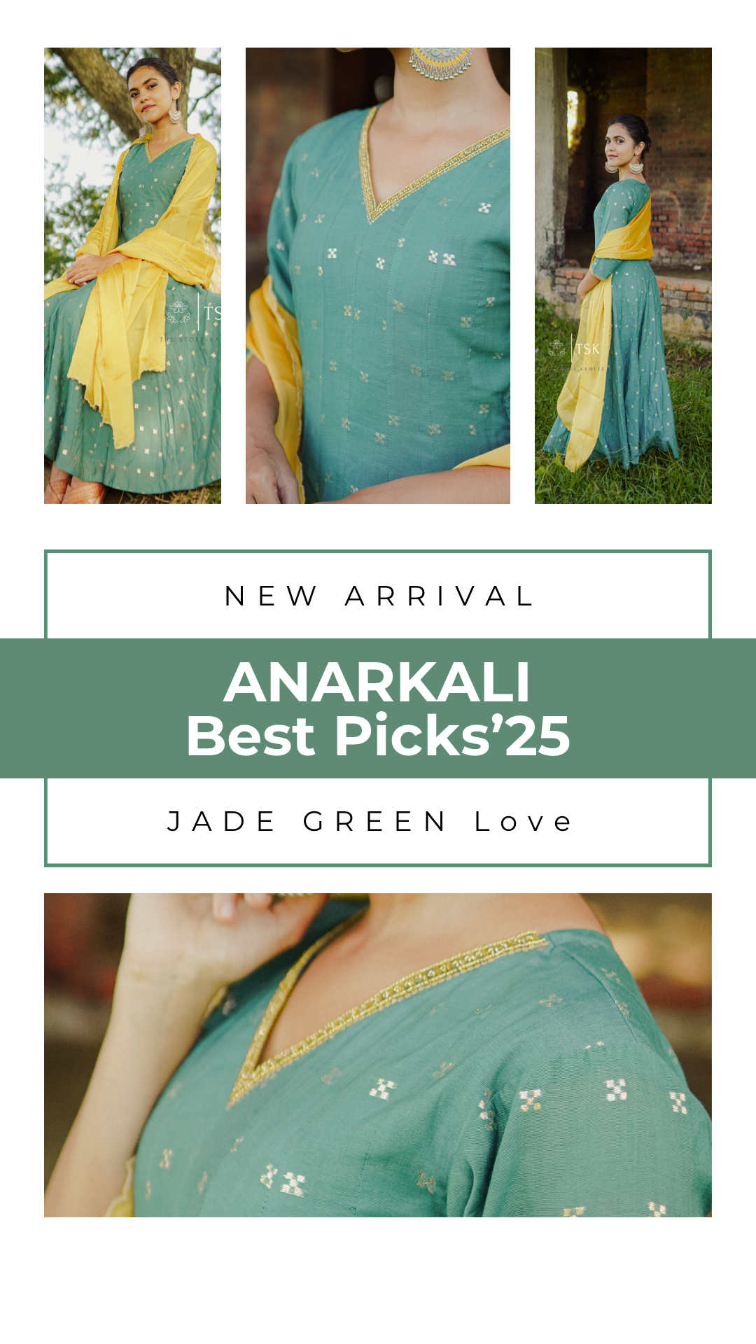 Make a stunning statement at your haldi or any traditional rasm with this exquisite jade green chanderi kurta, featuring intricate sequin-cut bead detailing and a beautifully scalloped sunset dupatta.