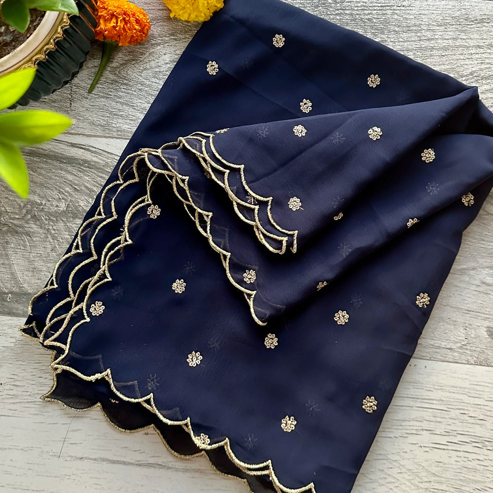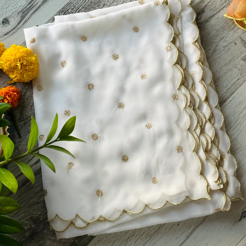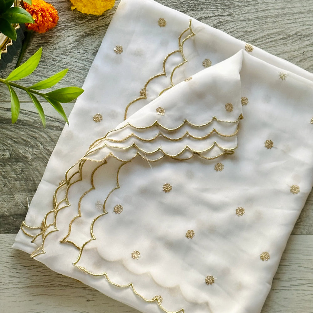 Purely Handmade Scallops for perfect detailing with golden Zari.