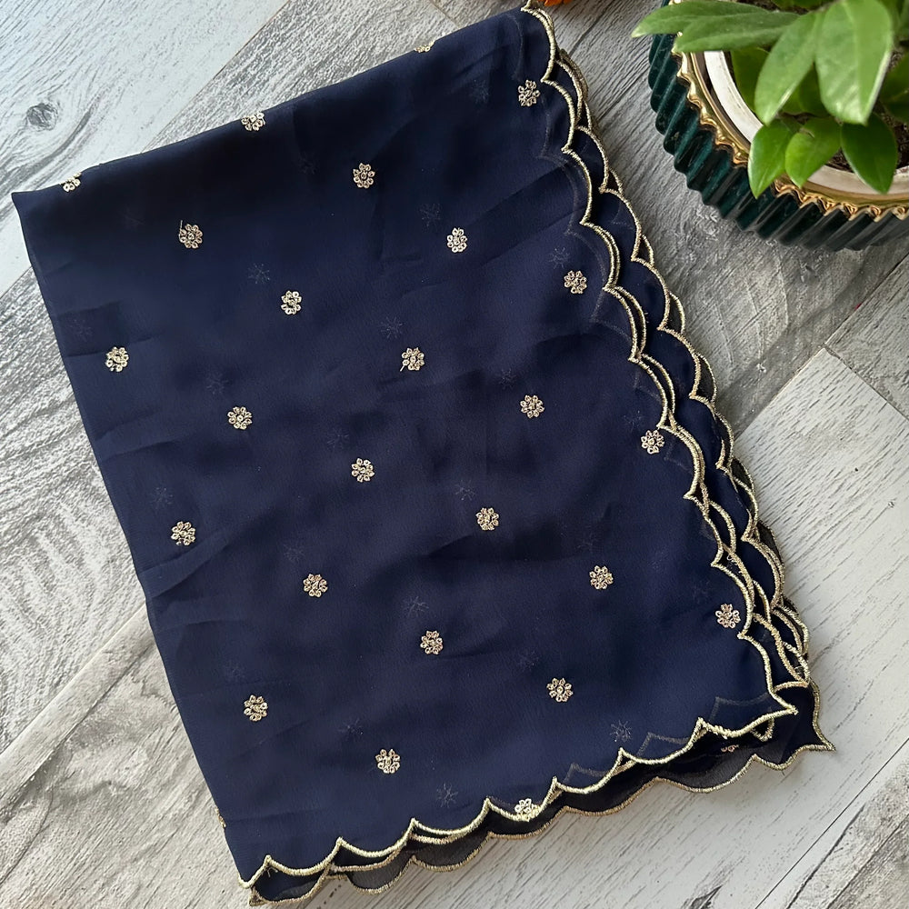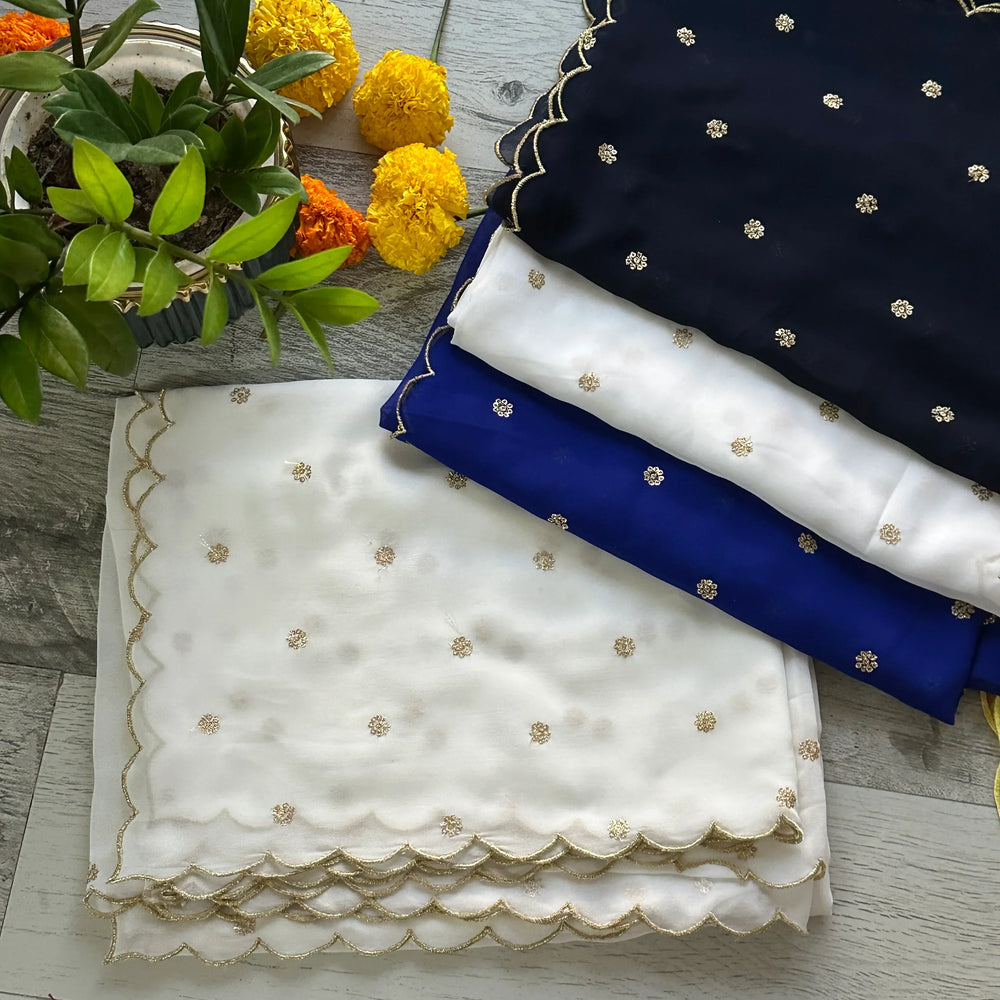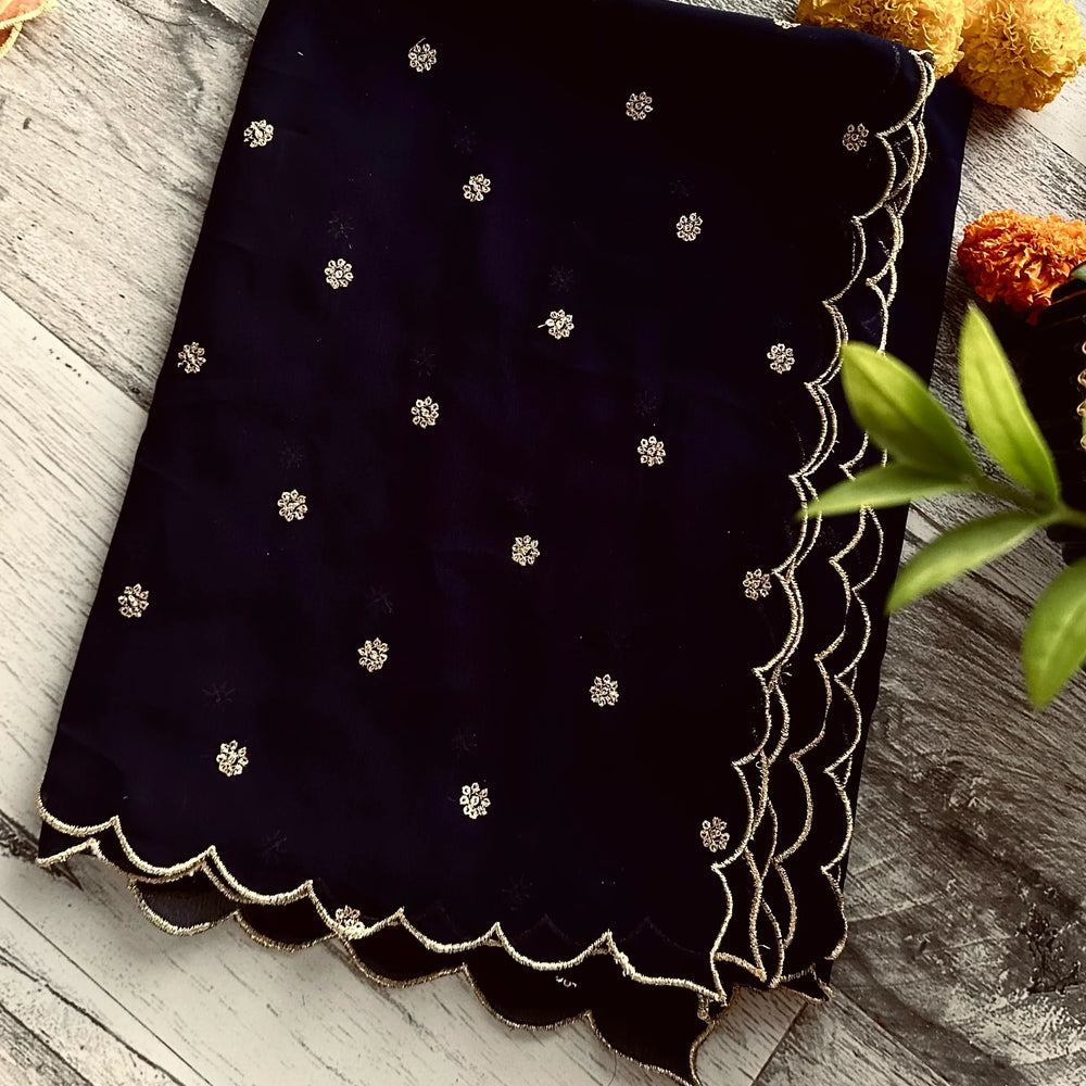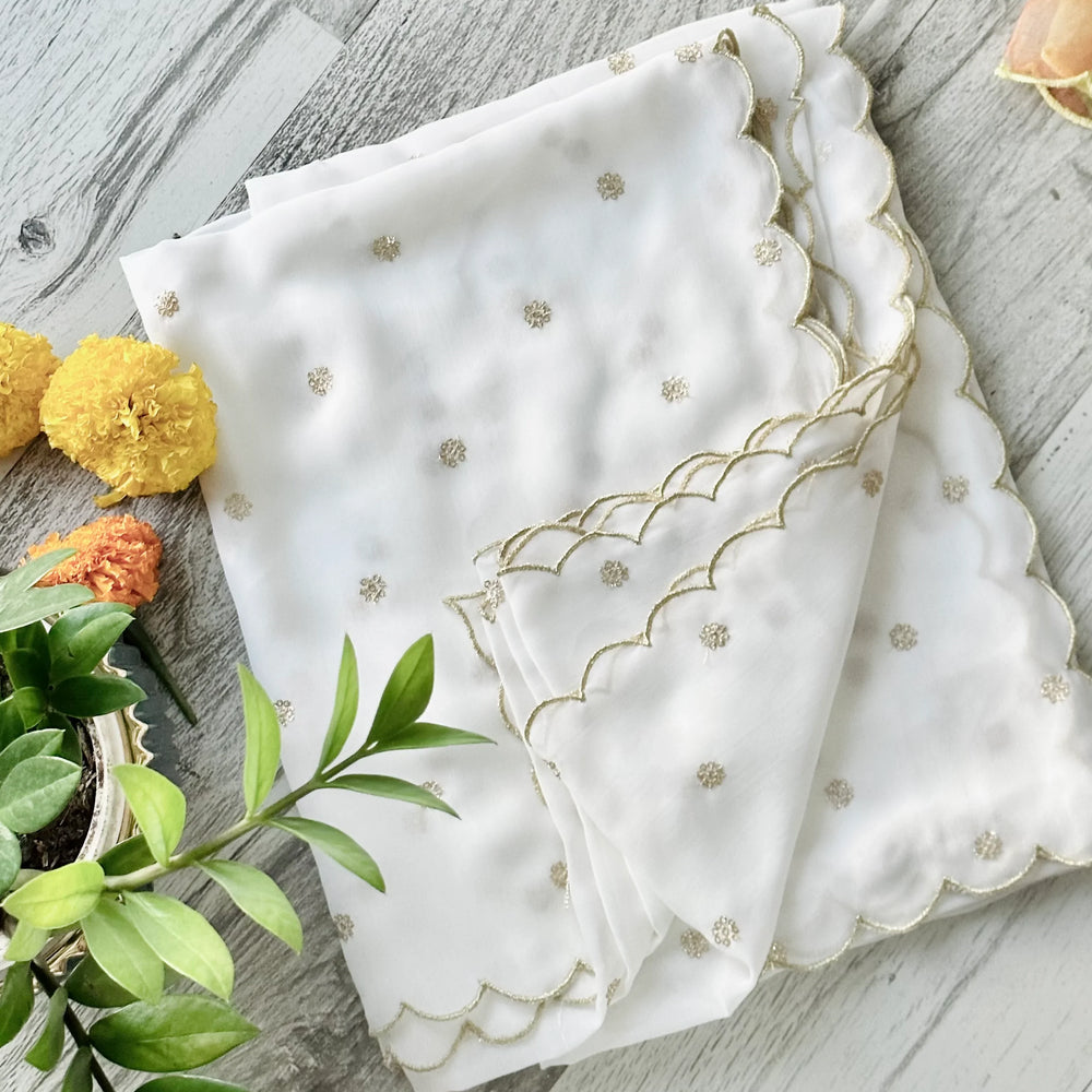 Purely Handmade Scallops for perfect detailing with golden Zari.