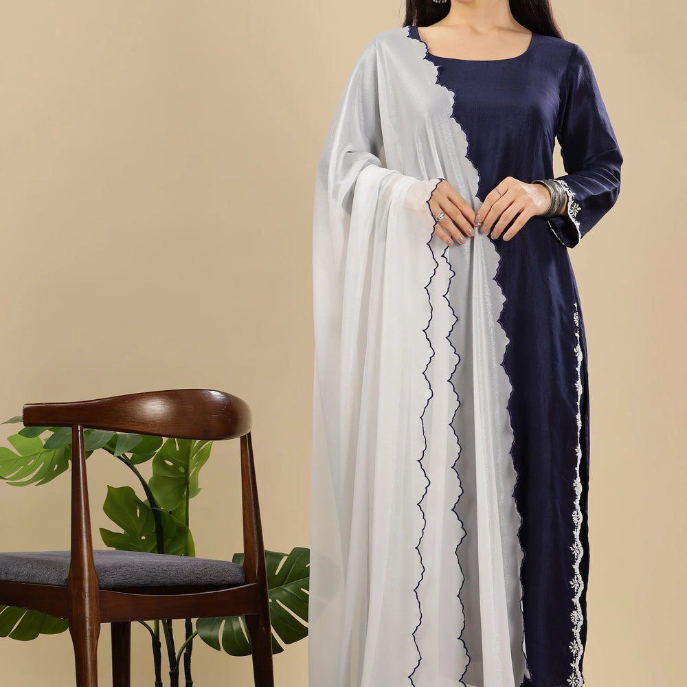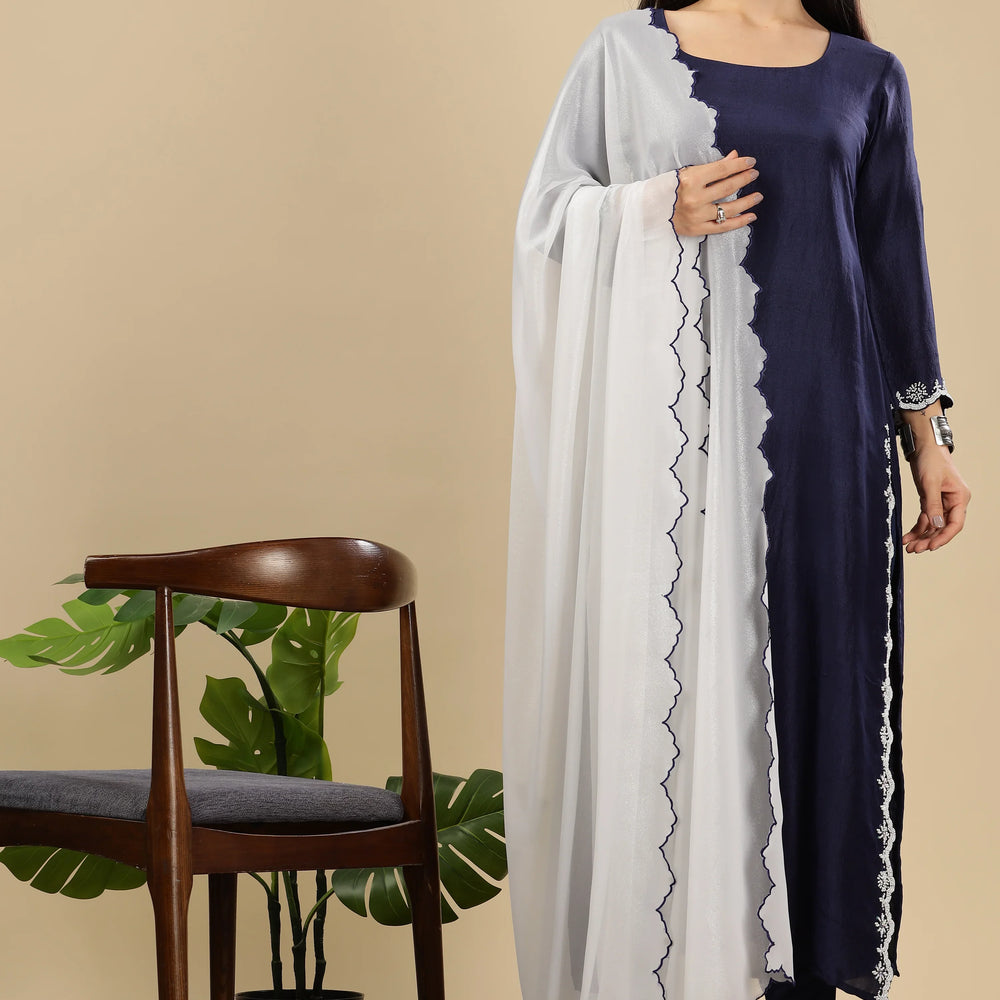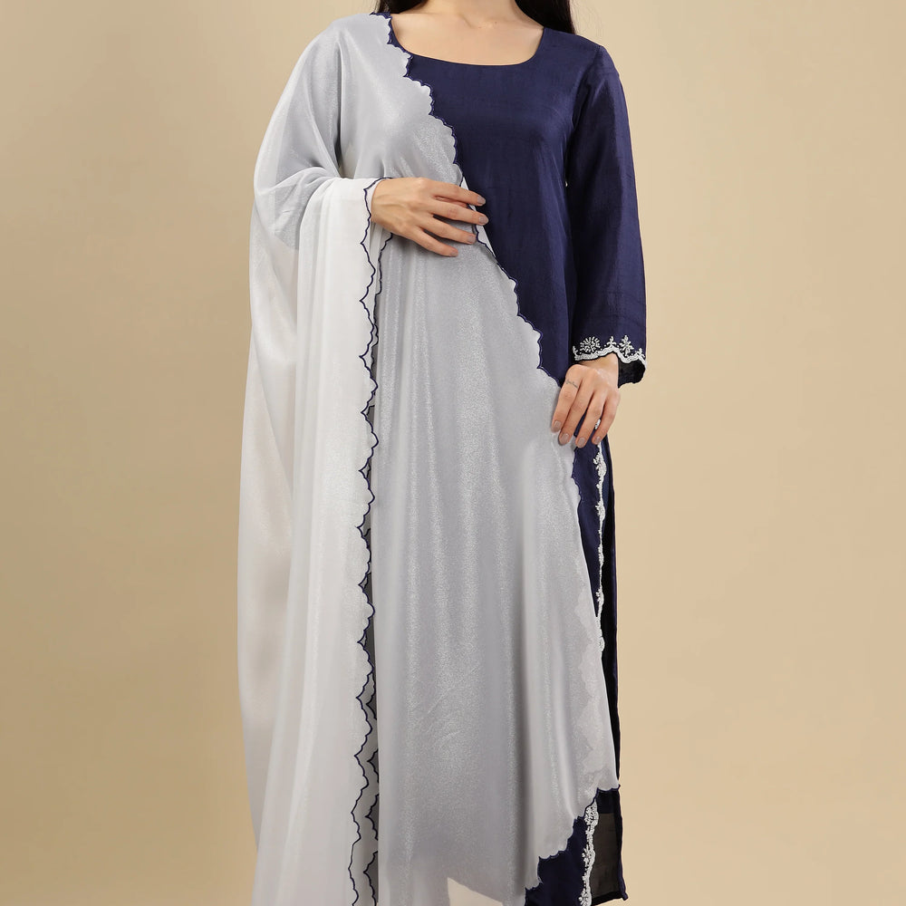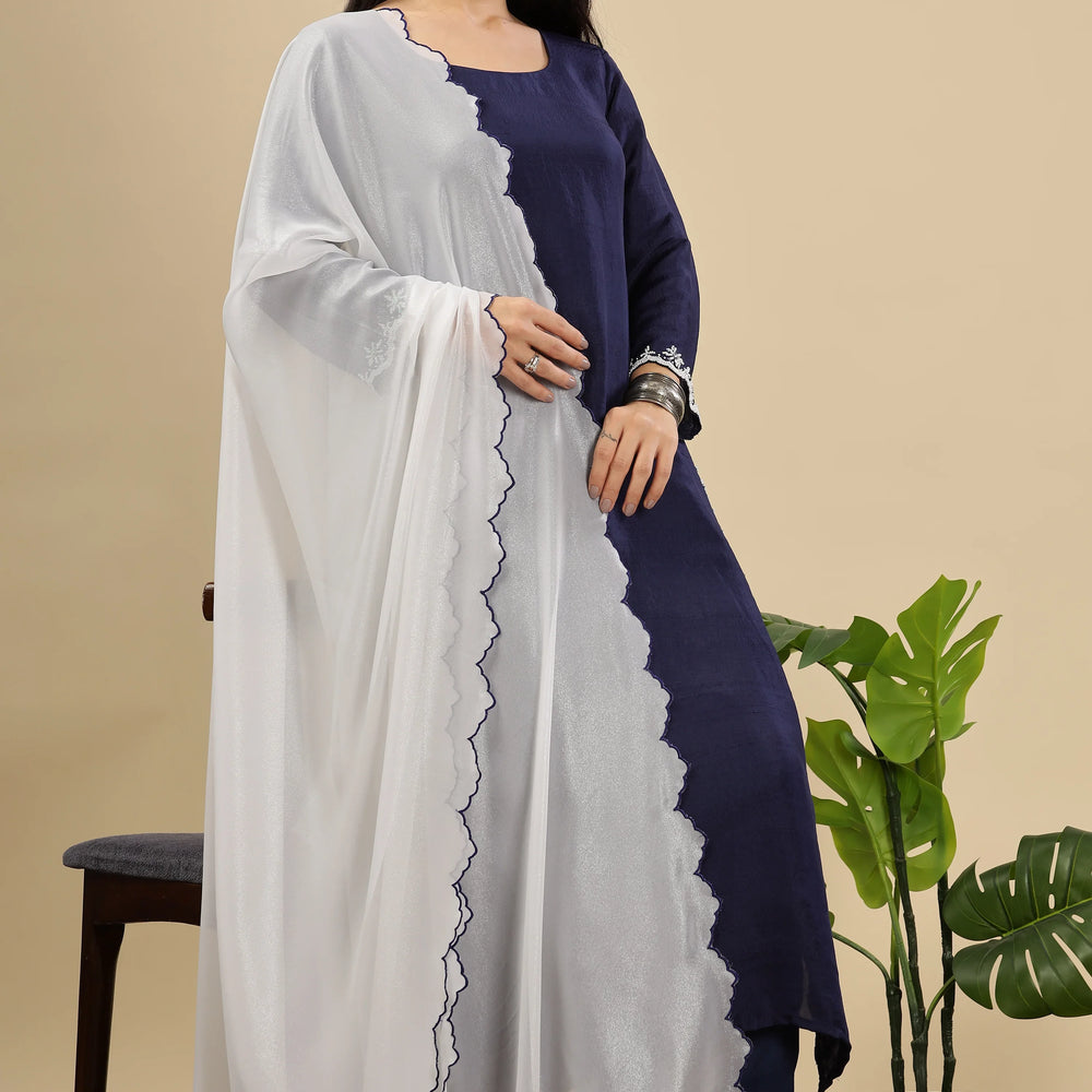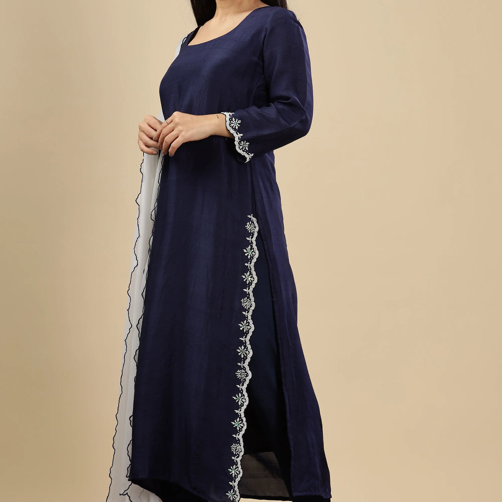 Regular price Rs. 4,699.00Mul chanderi straight slit heavy detailing kurta set with beautiful hand embroidery on both slits and sleeves, Scalloped shimmer georgette Dupatta add luxurious look on top of it. Perfect for Any Party Ocassions.