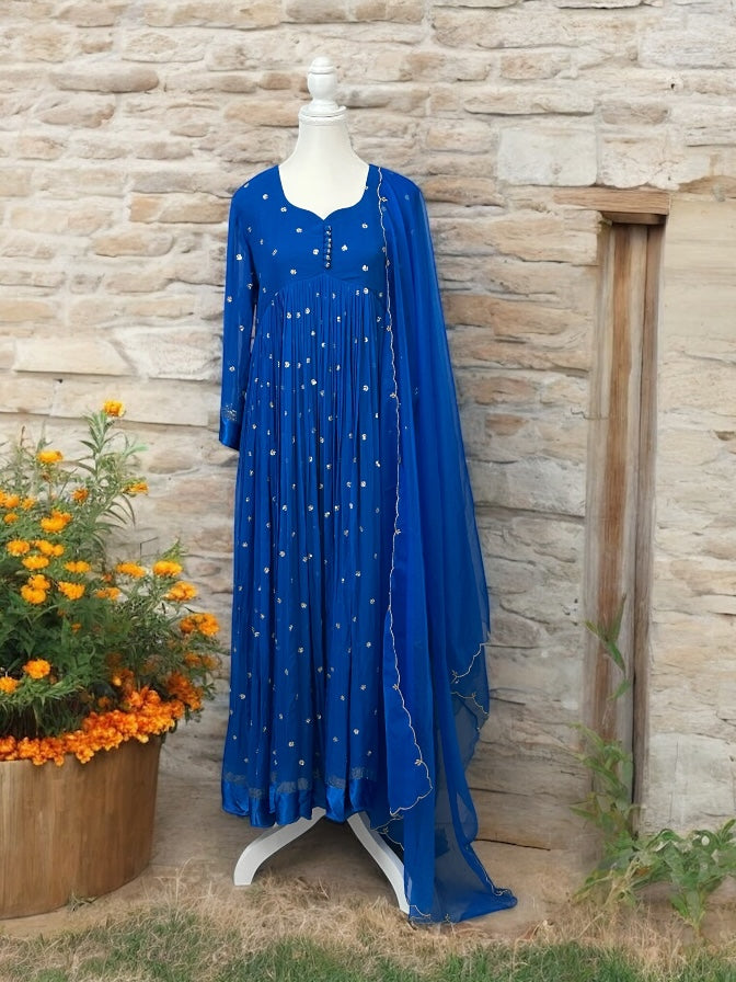 Regular price Rs. 3,600.00Gorgeous cobalt blue viscose georgette with sequins embellished all over kurta with beautiful scalloped soft organza Dupatta is perfect for any occasion.