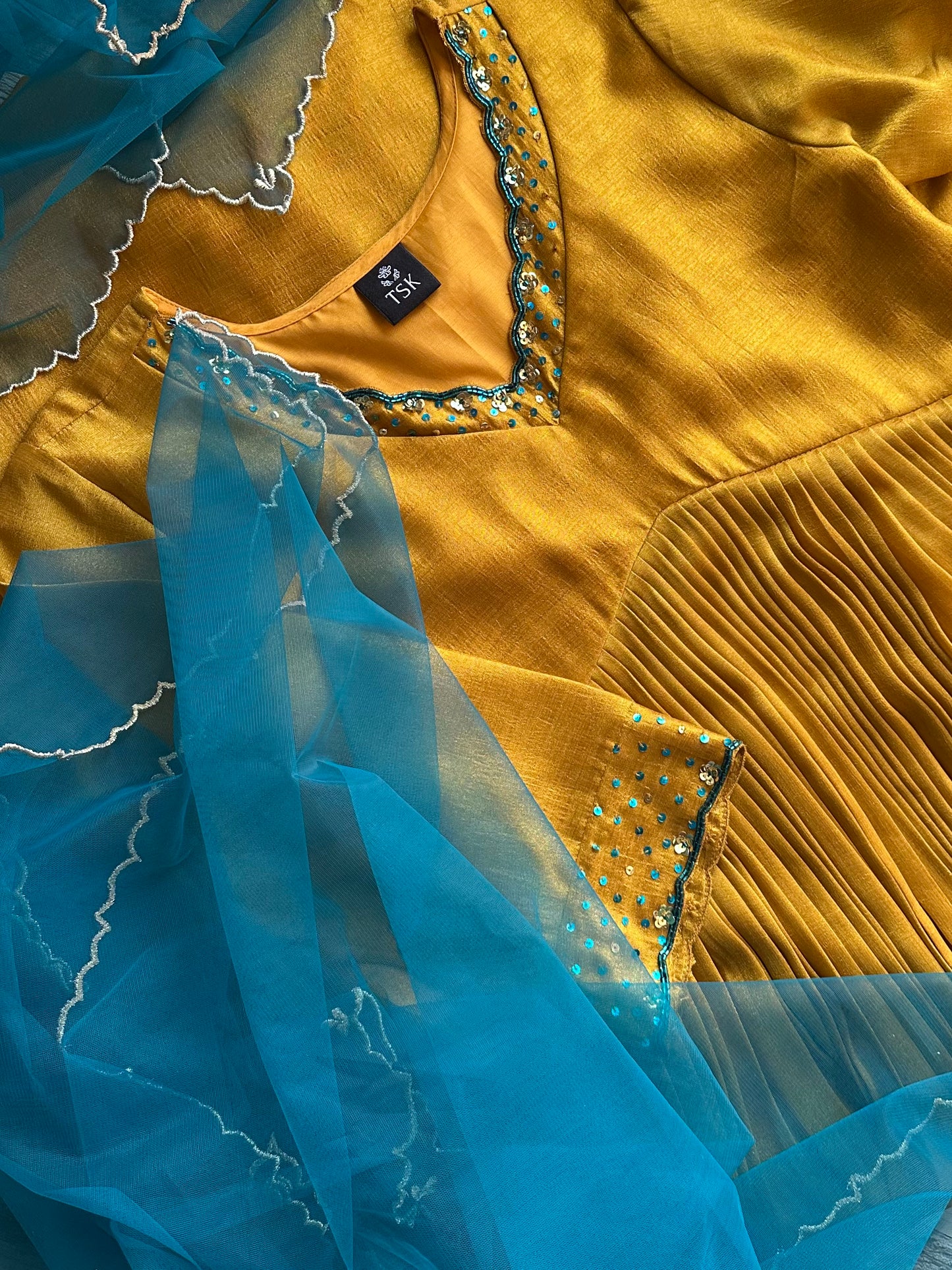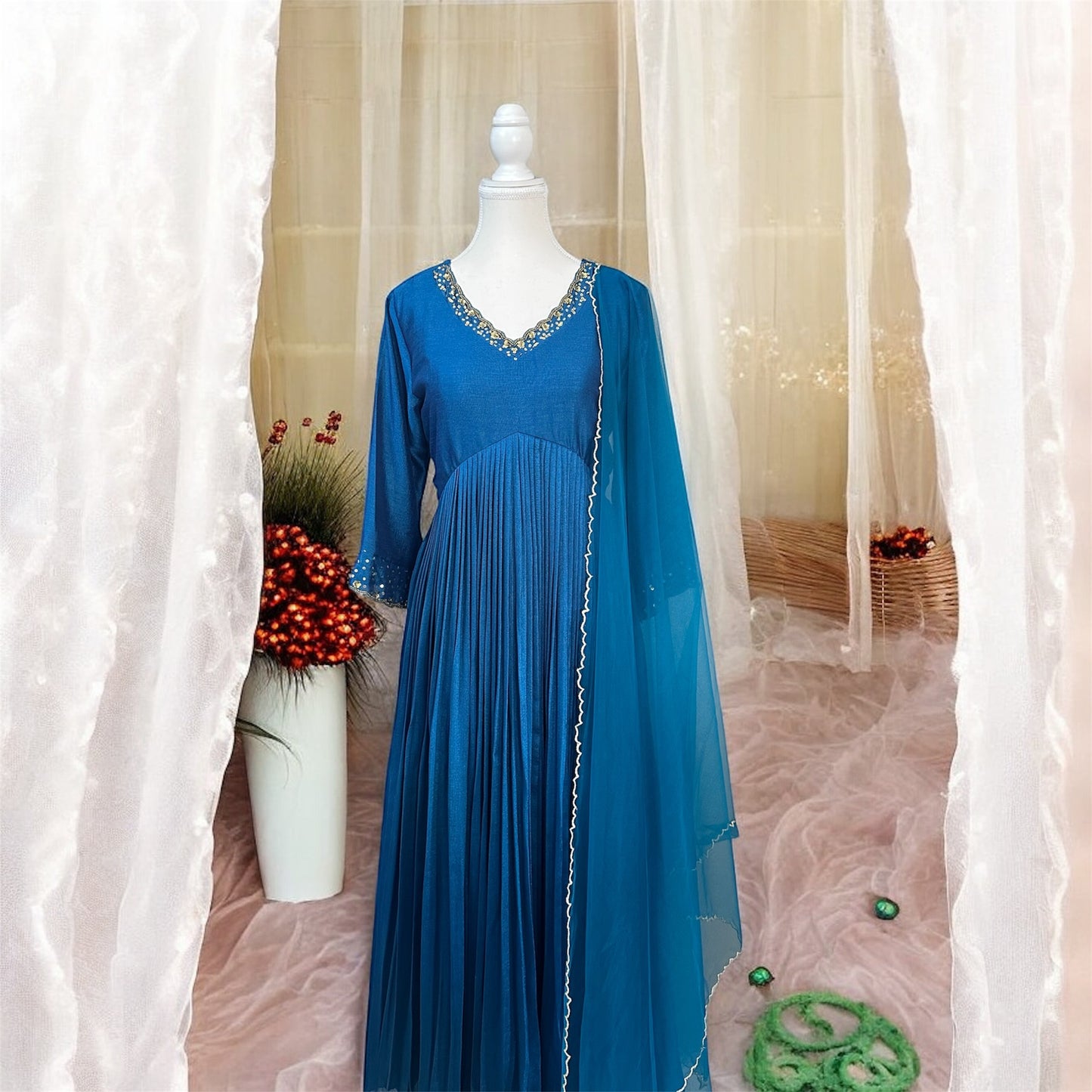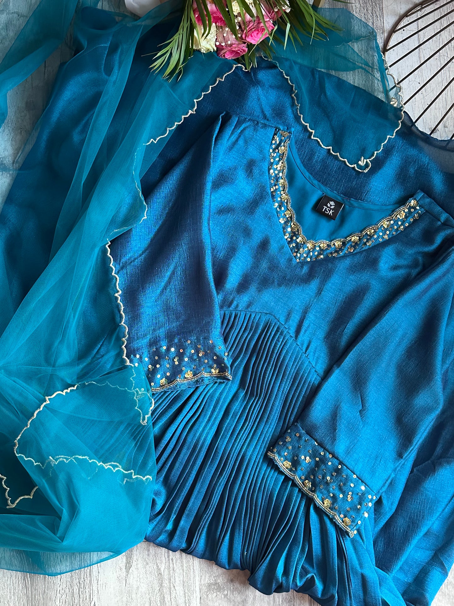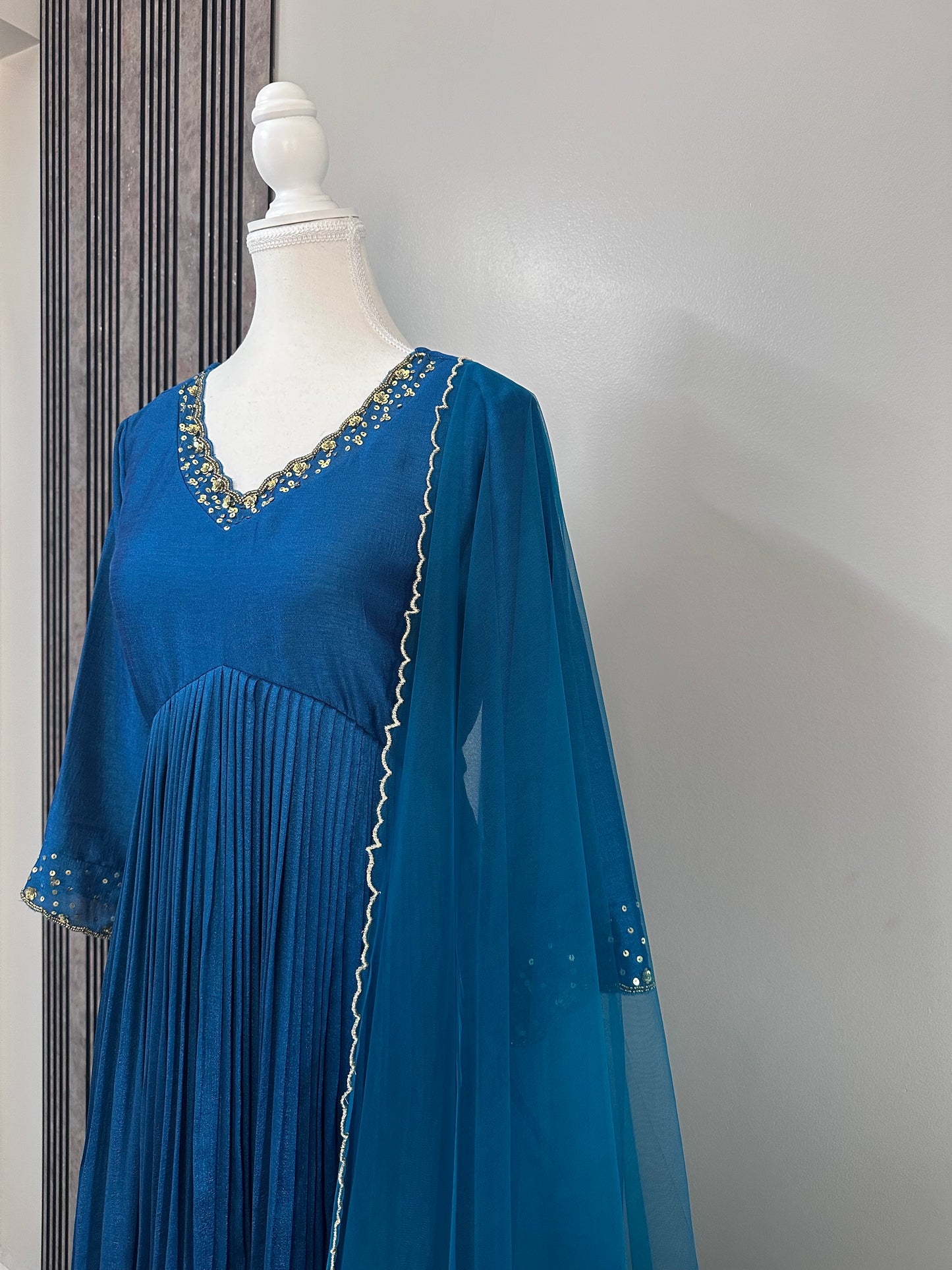A graceful, flowy ensemble in a rich Deep Teal blue tone, featuring a softly pleated silhouette that adds movement and elegance. The V-neckline is highlighted with fine golden hand embroidery, lending a subtle festive glow. Three-quarter sleeves are finished with minimal gold detailing, keeping the look refined and balanced. Paired with a lightweight net sheer dupatta with golden Scallops ,this piece blends timeless charm with modern sophistication—perfect for festive evenings, intimate celebrations, or elegant day events.