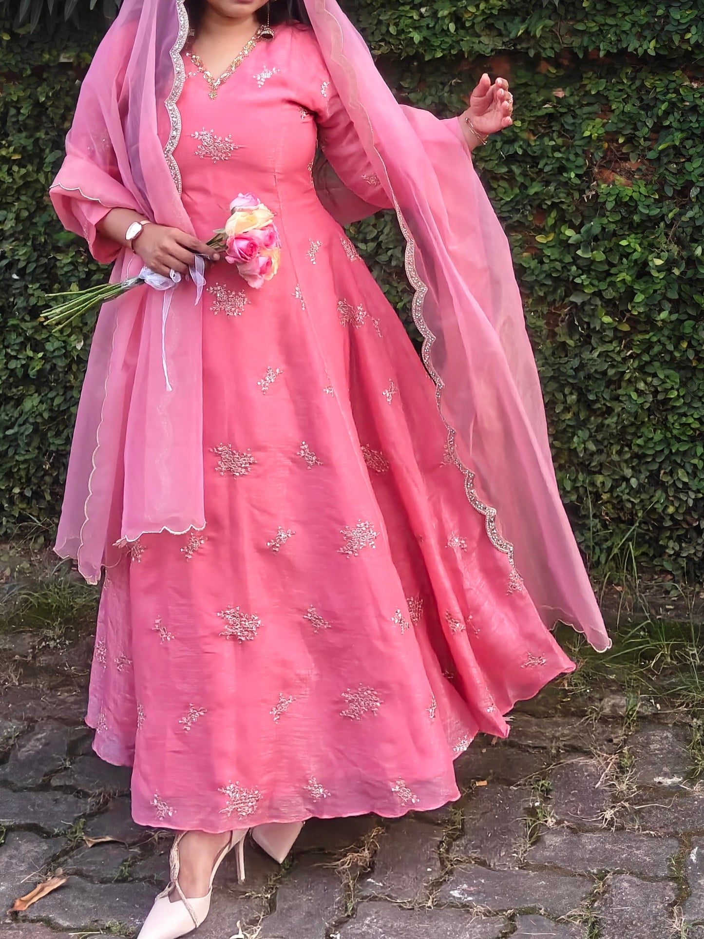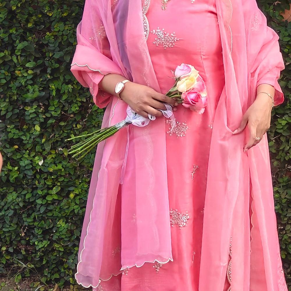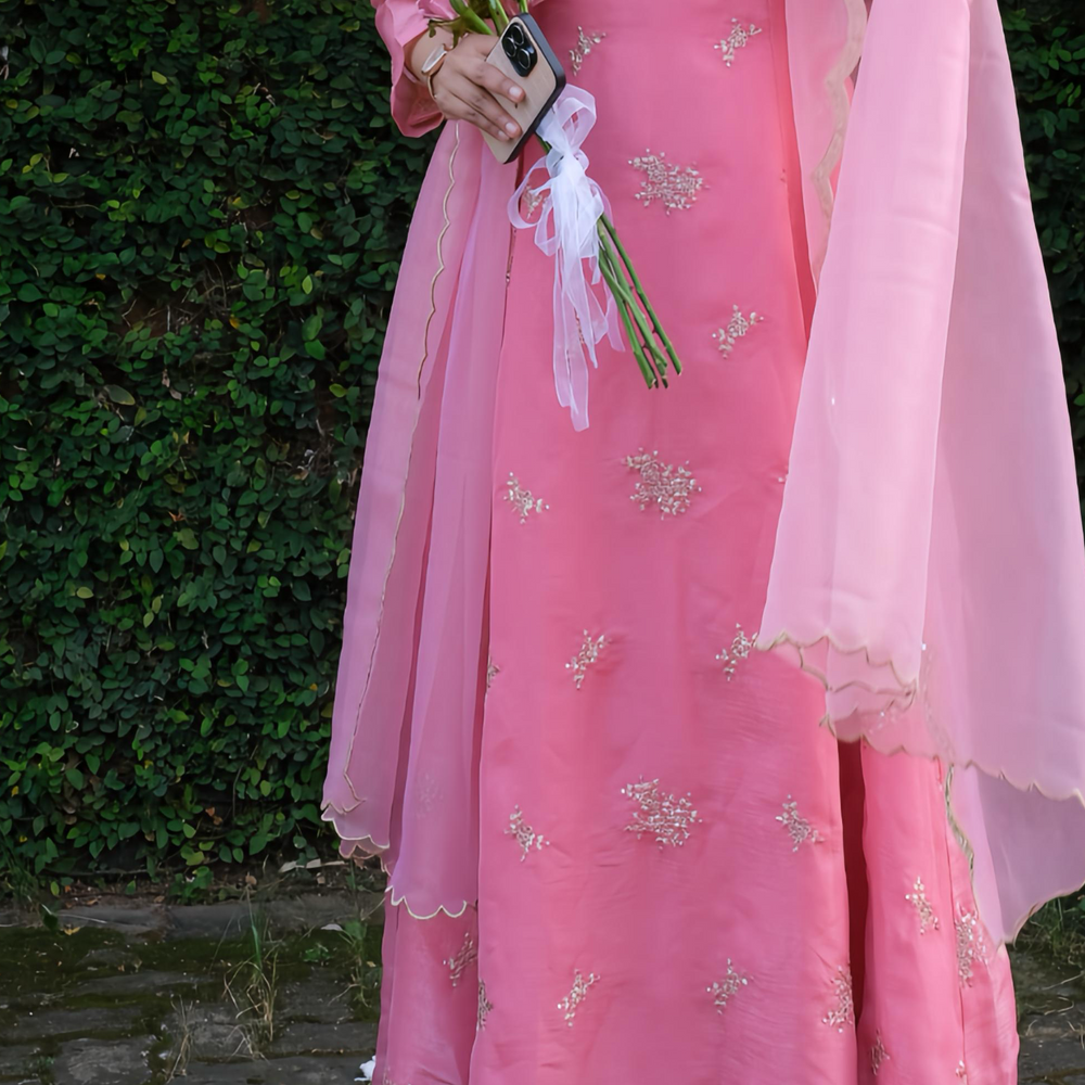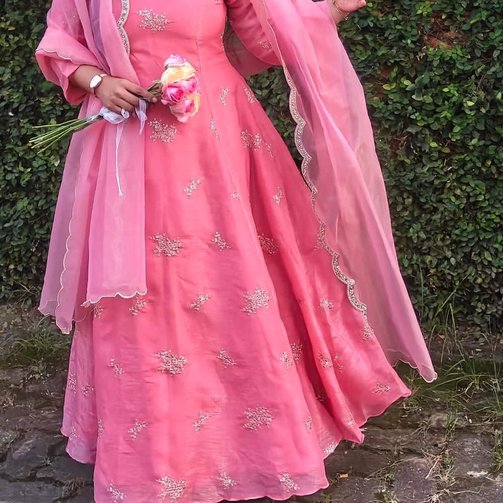 Step into timeless elegance with this blush-rose/Rustic Orange Anarkali ensemble, beautifully crafted with fine handwork. The neckline is adorned with intricate beads and sequins embroidery, adding a soft shimmer that elevates the entire look. The flare of the Anarkali falls gracefully, creating a flowy silhouette perfect for any festive or celebratory moment.