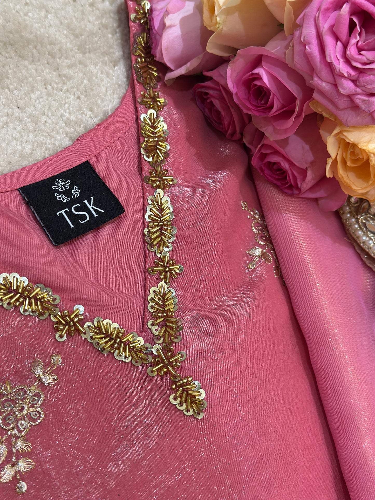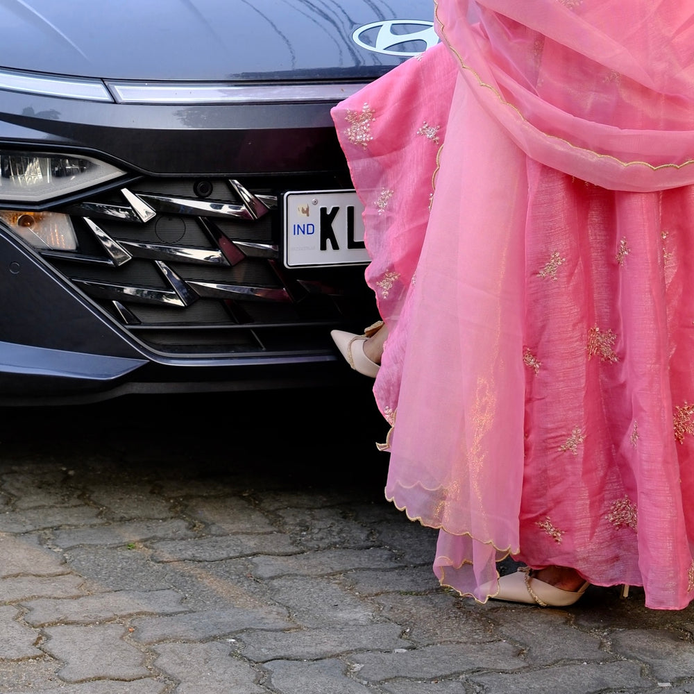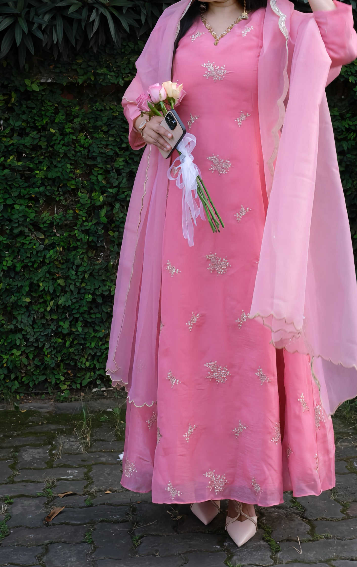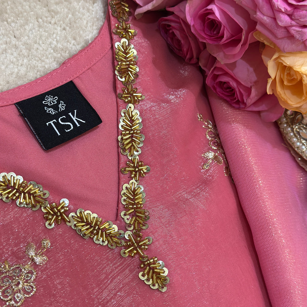 Step into timeless elegance with this blush-rose/Rustic Orange Anarkali ensemble, beautifully crafted with fine handwork. The neckline is adorned with intricate beads and sequins embroidery, adding a soft shimmer that elevates the entire look. The flare of the Anarkali falls gracefully, creating a flowy silhouette perfect for any festive or celebratory moment.