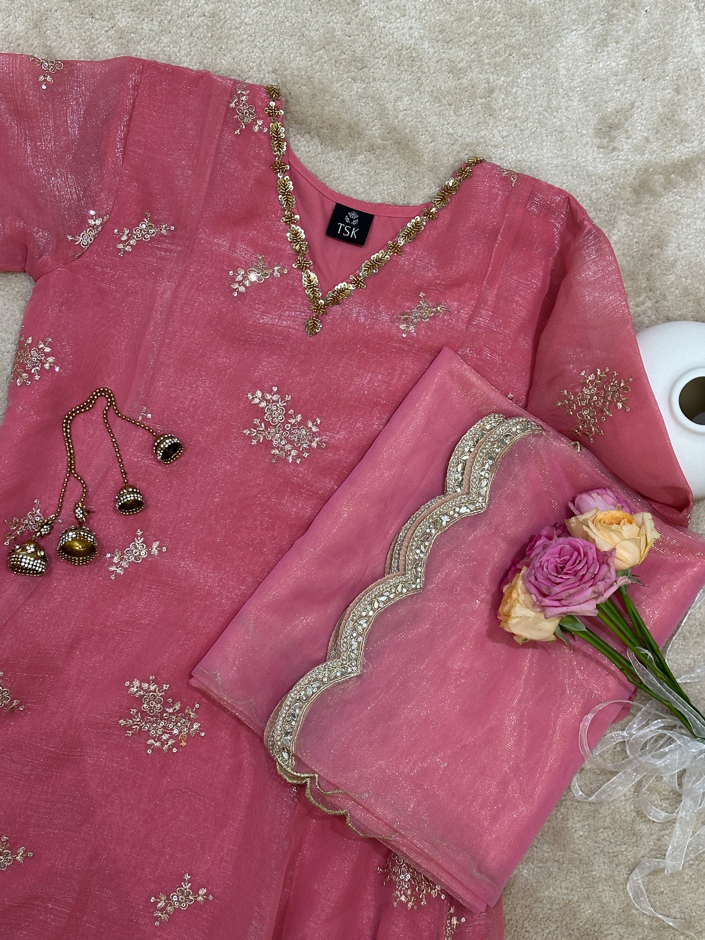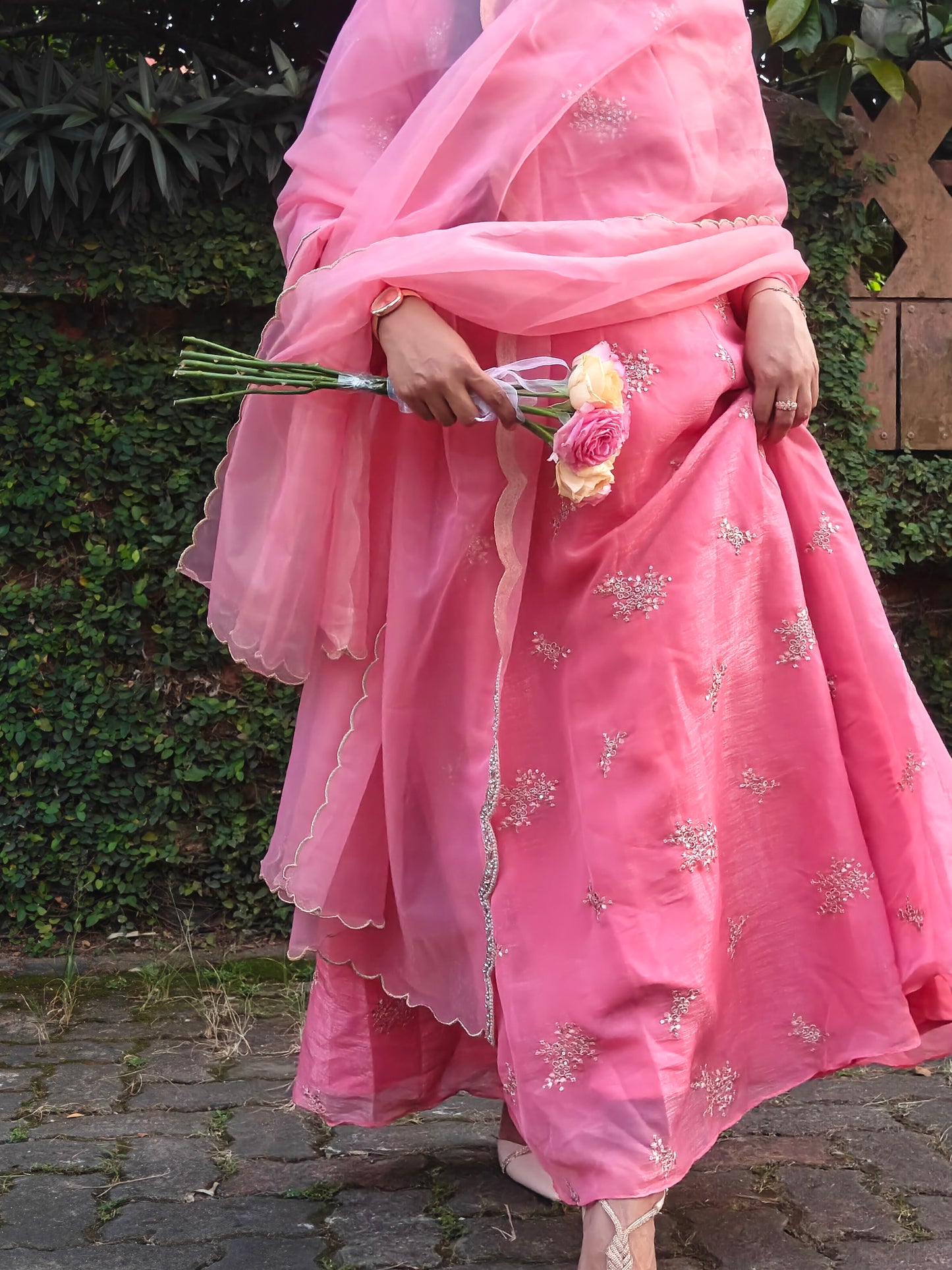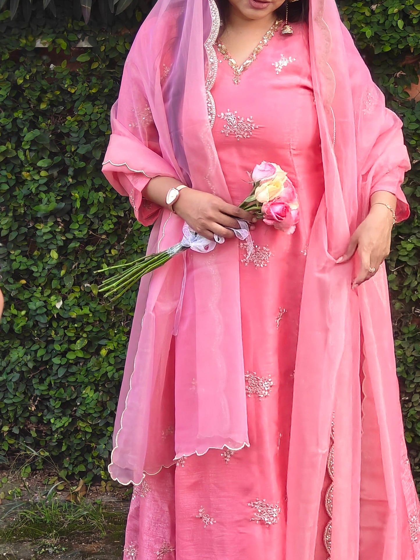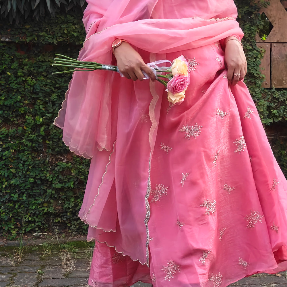 The shimmer Toned dupatta, finished with a delicately scalloped border, adds a dreamy, ethereal touch making this outfit a complete showstopper.