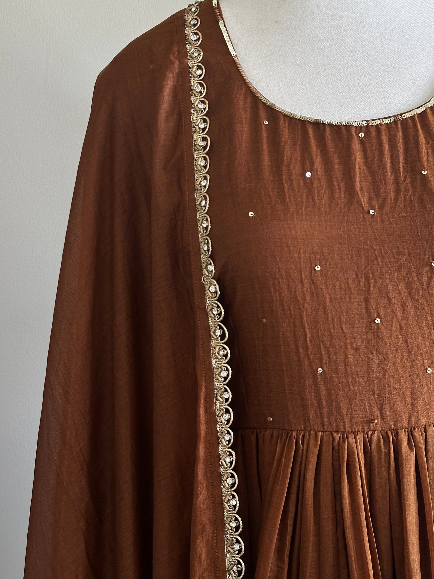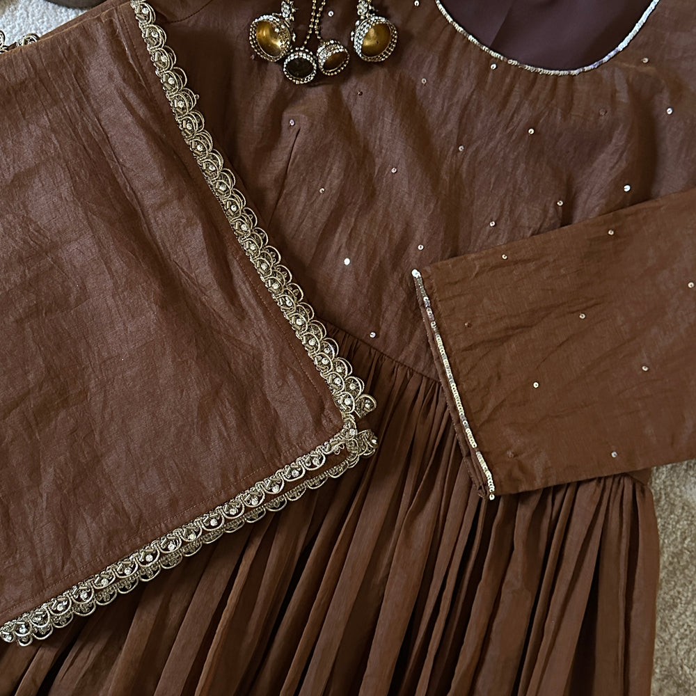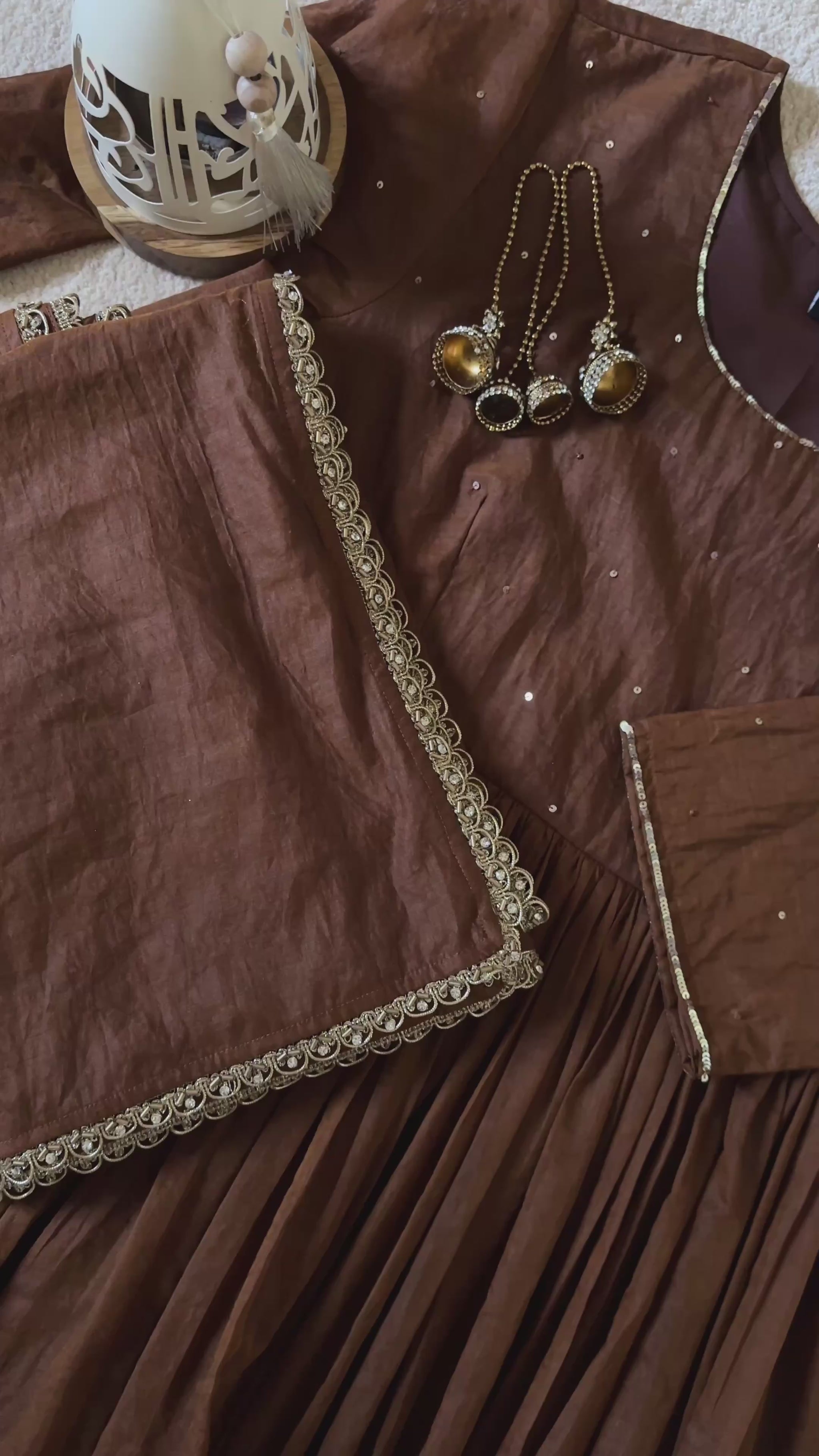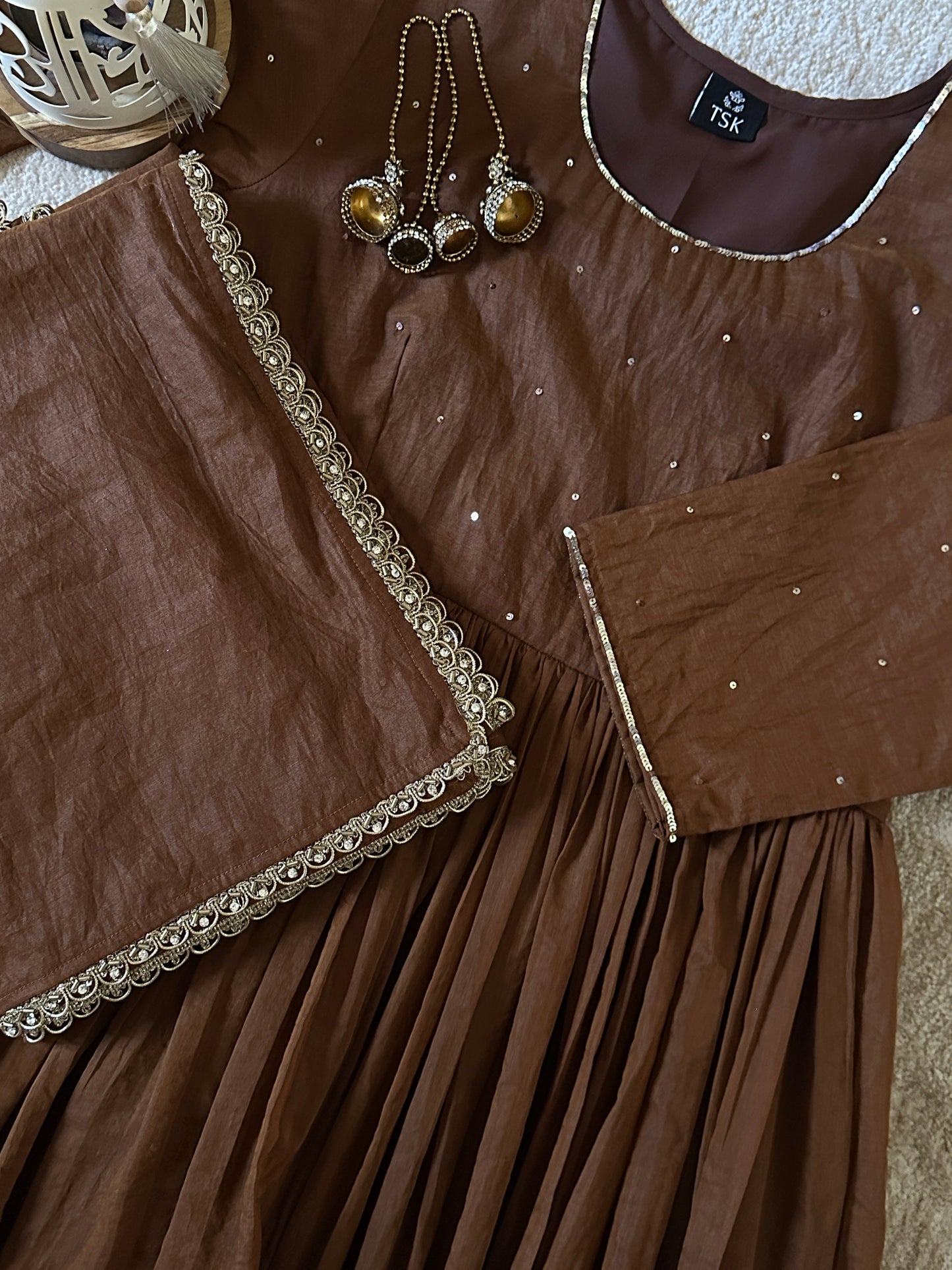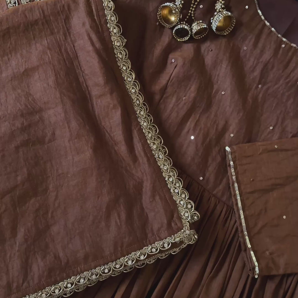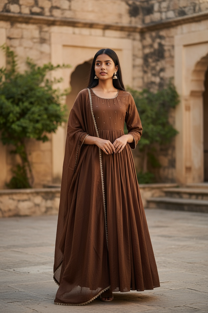 A timeless ensemble crafted in rich mocha brown, this elegant set features delicate hand-embroidered zari butis scattered all over the yoke ,adding a subtle festive sheen. The neckline and sleeves are adorned with fine embroidery detailing, lending a graceful touch of shimmer. The flared silhouette flows beautifully, offering both comfort and charm. Paired with a matching dupatta finished with intricate scalloped embroidery lace, this outfit exudes understated luxury perfect for festive gatherings and any Indian tradition.