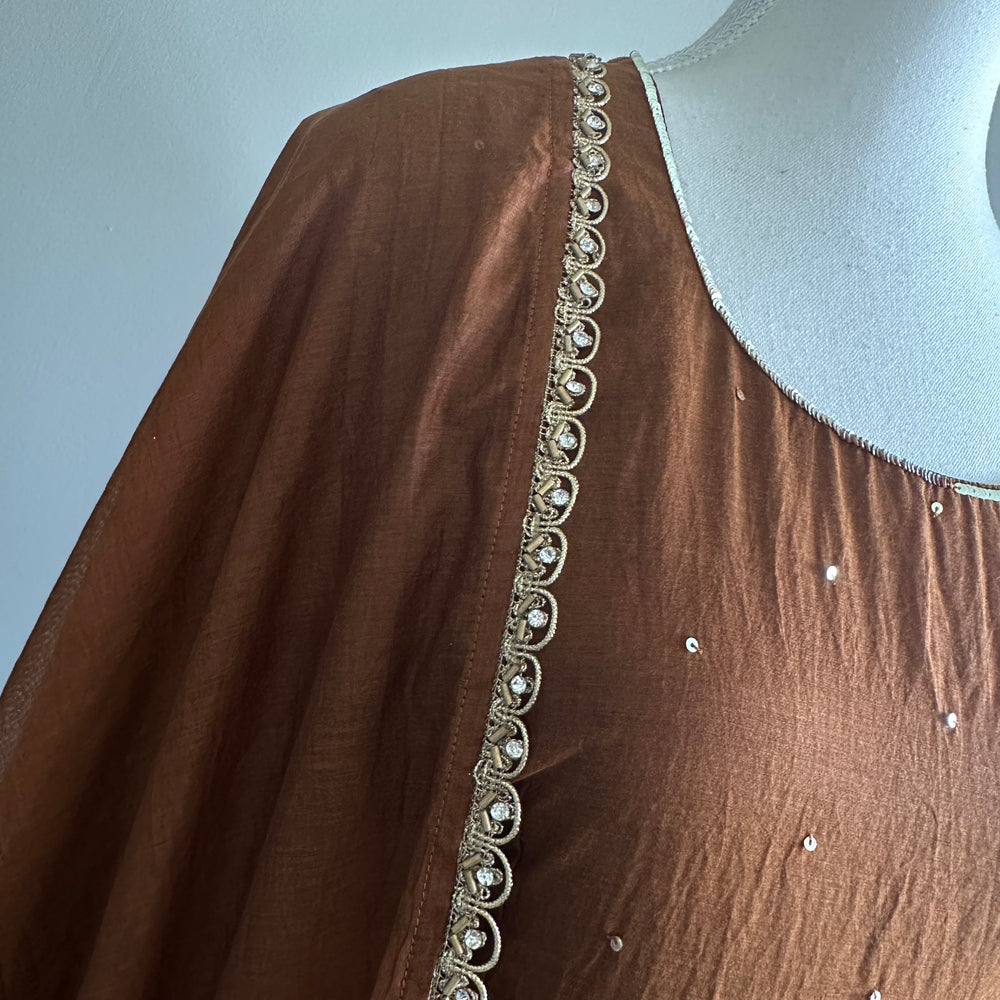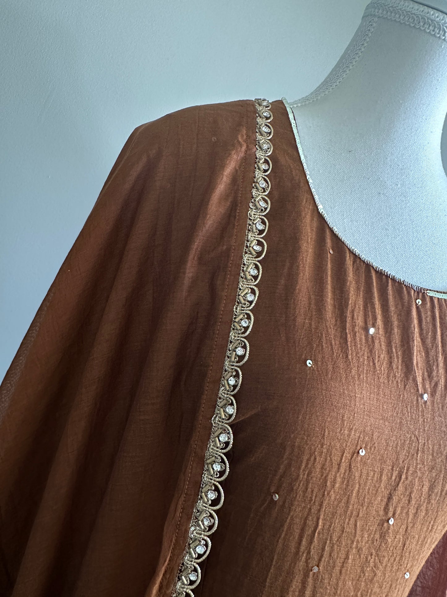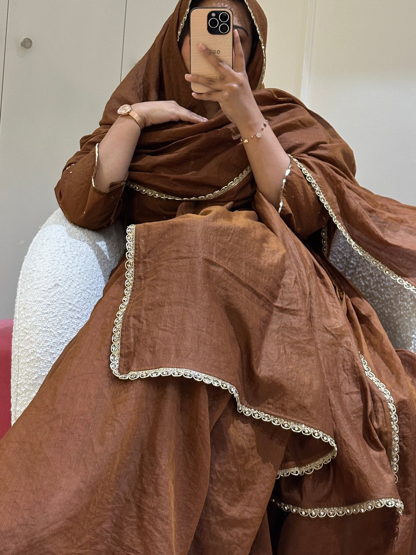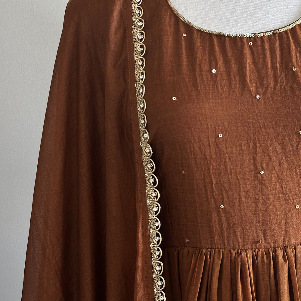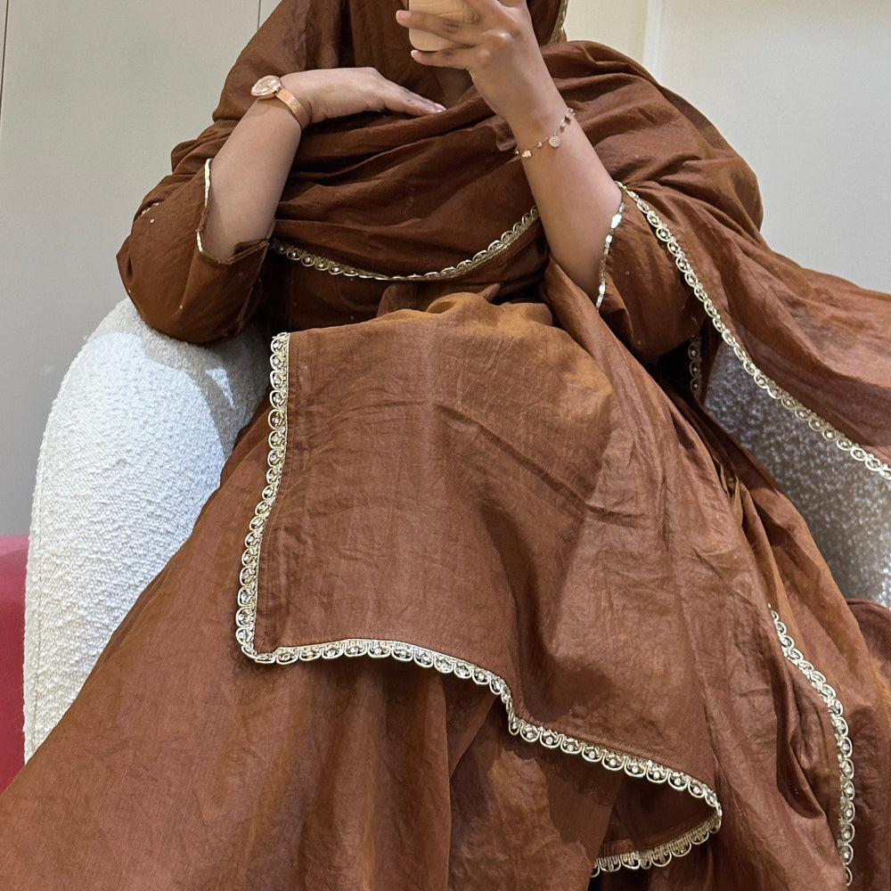 A timeless ensemble crafted in rich mocha brown, this elegant set features delicate hand-embroidered zari butis scattered all over the yoke ,adding a subtle festive sheen. The neckline and sleeves are adorned with fine embroidery detailing, lending a graceful touch of shimmer. The flared silhouette flows beautifully, offering both comfort and charm. Paired with a matching dupatta finished with intricate scalloped embroidery lace, this outfit exudes understated luxury perfect for festive gatherings and any Indian tradition.